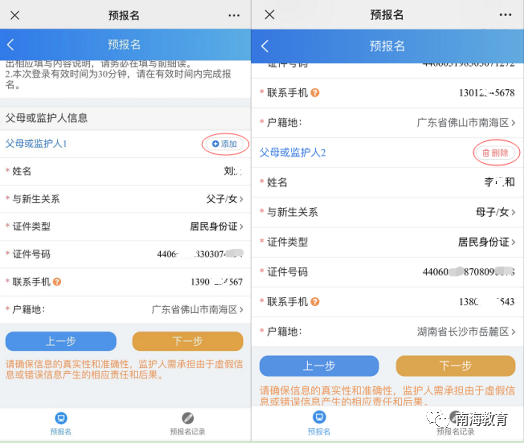 若要填写多个父母或监护人信息,可点击“添加”按钮,即可输入多个父母或监护人信息。若要删除父母或监护人信息,点击“删除”按钮,即可删除父母或监护人信息。如下图所示。
