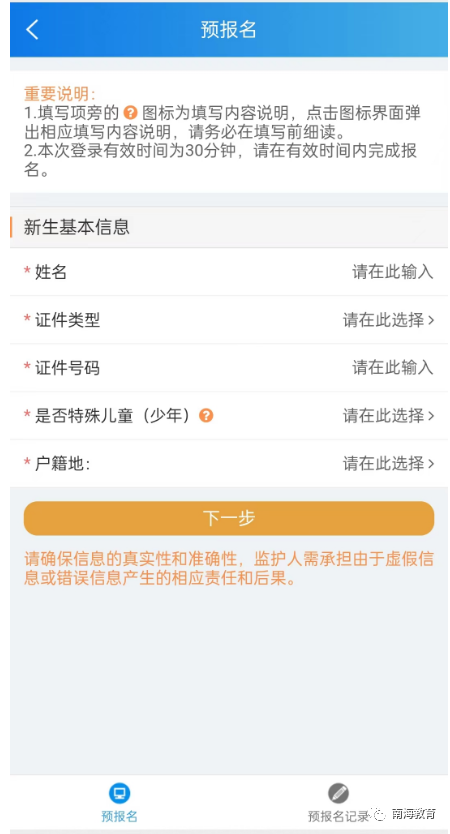 在功能菜单点击预报名,进入新生基本信息填写页面,填写新生基本信息。新生的基本信息包括姓名、身份证类型、身份证号、是否特殊儿童(少年)和户籍地。在“预报名”页面,输入新生的姓名,选择新生身份证类型,填写新生的身份证号码,选择是否特殊儿童(少年),选择户籍地。如下图所示。