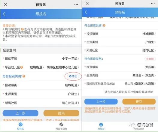 在“符合报读类别1”信息栏下,选择报读镇街后,选择生源类别,选择所属社区。如果家长需要选报两种报读类别,可点击“添加”按钮,即可填写两个报读类别信息,如图所示。