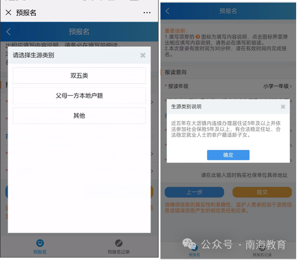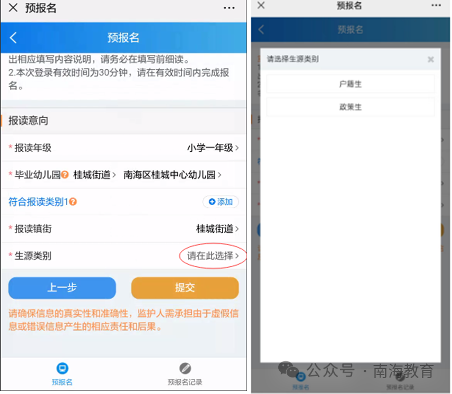 填写父母或监护人信息,点击下一步,选择报读年级、报读街镇、生源类别、在报读意向页面,选择报读年级后,选择新生所毕业的幼儿园或小学。