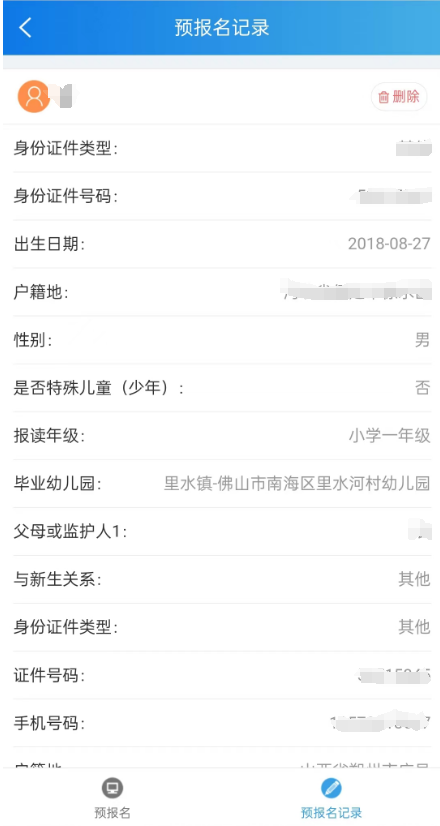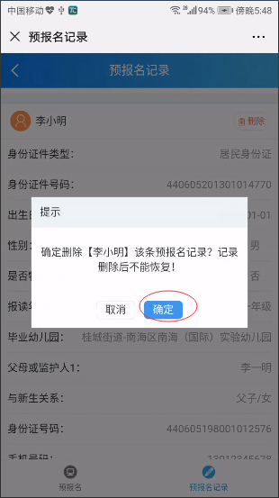 若要删除预报名记录,重新预报名,则可在预报名记录页面,点击“删除”按钮,会弹出温馨提示“确定删除[xxxx]该条预报名记录?记录删除后不能恢复!”,在提示框,点击确定按钮,即可成功删除预报名记录。如下图所示。