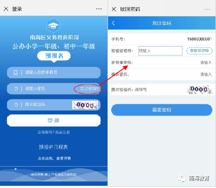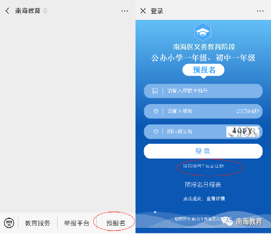 关注“南海教育”微信公众号,在公众号的菜单栏中点击“预报名”按钮,然后在子菜单中点击“网上报名”,打开预报名系统登录页,如图所示。