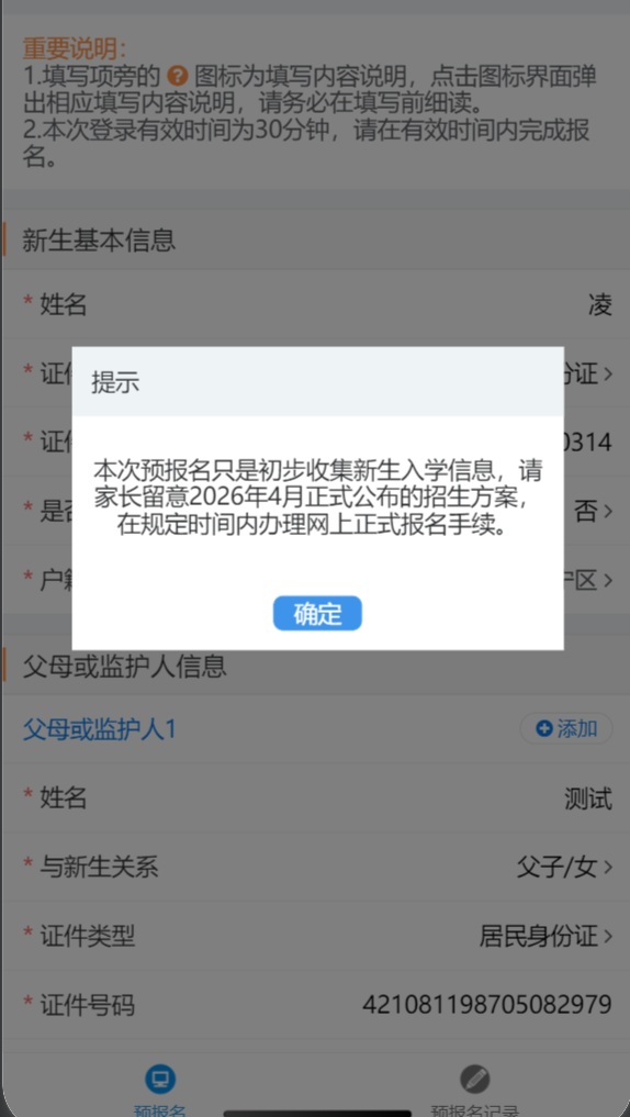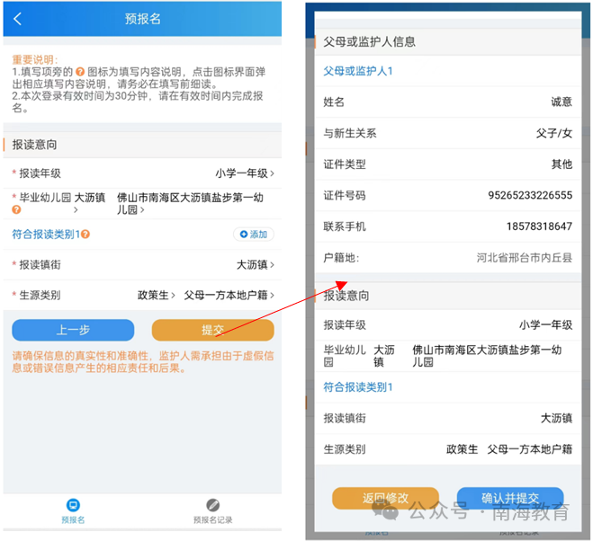 家长仔细检查填写的信息是否填写错误,如果填写错误,可点击“返回修改”;如果填写的信息全部正确,可点击“确认并提交”。如图所示。当点击“确认并提交”后,系统会弹出“预报名”成功的相应提示,请点击“确定”完成预报名操作。如图所示。